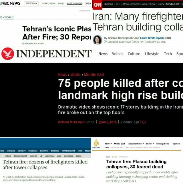 خبرگزاری‌ها و روزنامه‌های «الجزیره»، «گاردین»، «بی.بی‌.سی»، «NBC»، «CNN»، «ایندیپندنت»، «مترو»، «میرور»، «واشنگتن پست»، «دیلی استار»، «آسوشتیدپرس»، «رویترز»، «راشا تودی» و ... از جمله رسانه‌هایی بودند که به حادثه آتش‌سوزی و فروریختن ساختمان «پلاسکو» که صبح امروز (۳۰ دی‌ماه) در تهران رخ داد، پرداخته‌اند.