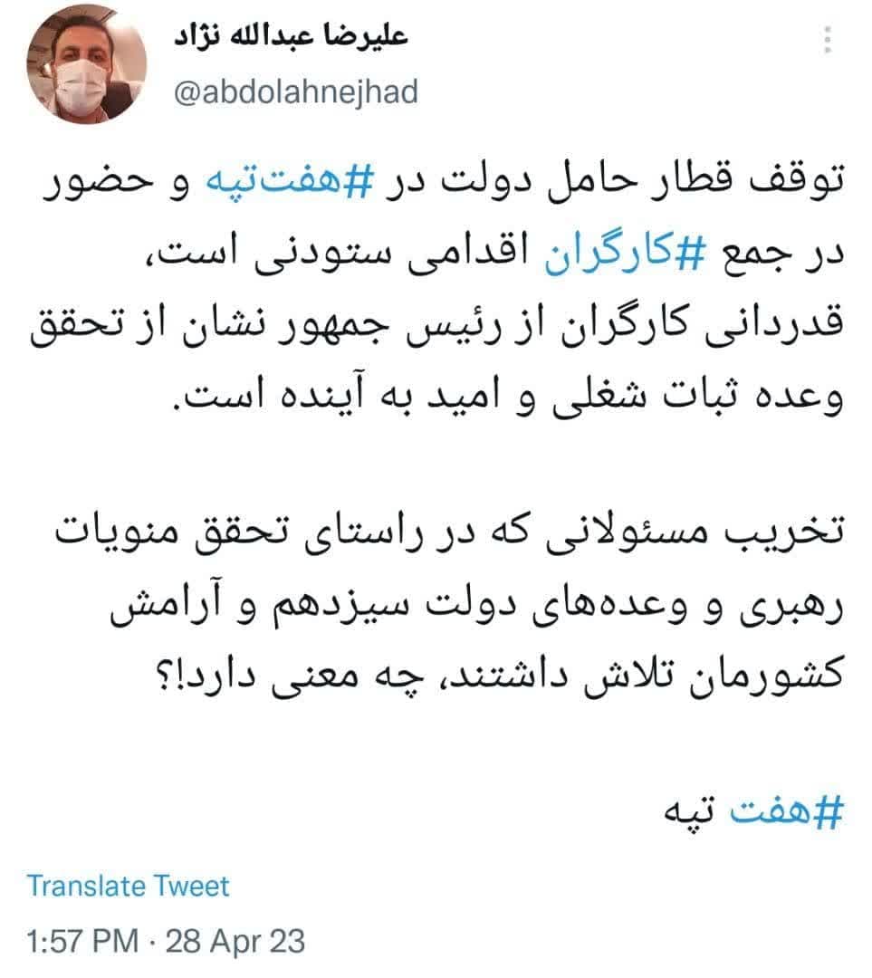 "علیرضا عبداللهنژاد" مدیر خبرگزاری خبر فوری در خوزستان در توئیتی اظهار داشت: توقف قطار حامل دولت در هفتتپه و حضور در جمع کارگران اقدامی ستودنی است، قدردانی کارگران از رئیس جمهور نشان از تحقق وعده ثبات شغلی و امید به آینده است.